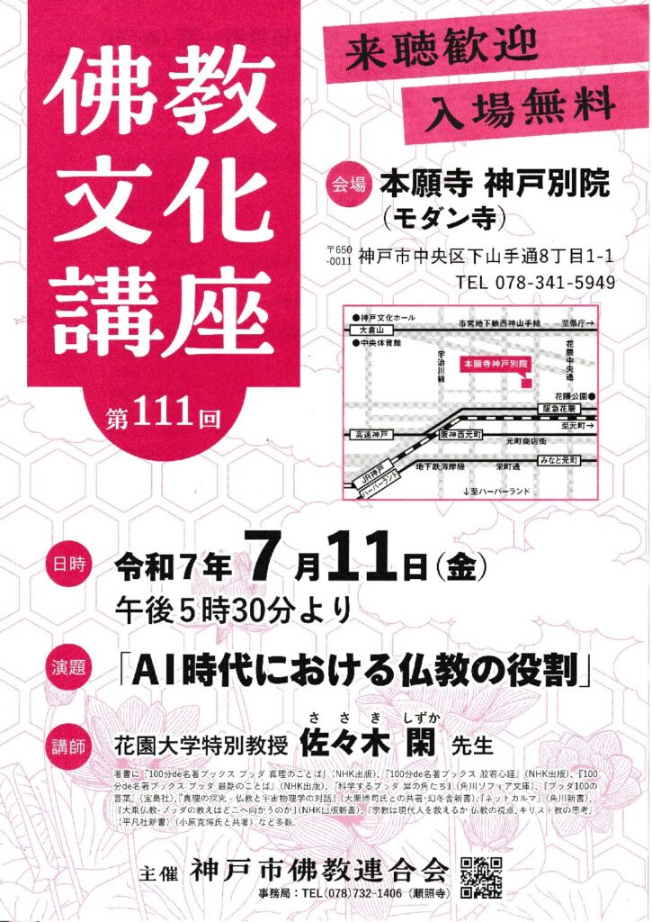 仏教文化講座ご案内 2025年6月18日 最終更新日時 : 2025年6月19日 kobe-buddhist 7月11日(金)午後5時30分より本願寺 神戸別院(モダン寺)にて、「佛教文化講座 第111回」を開催いたします。 ご興味のある方はぜひご参加ください。詳細は下記のPDFよりご確認いただけます。 佛教文化講座 第111回(表).pdfダウンロード 佛教文化講座 第111回(裏).pdfダウンロード